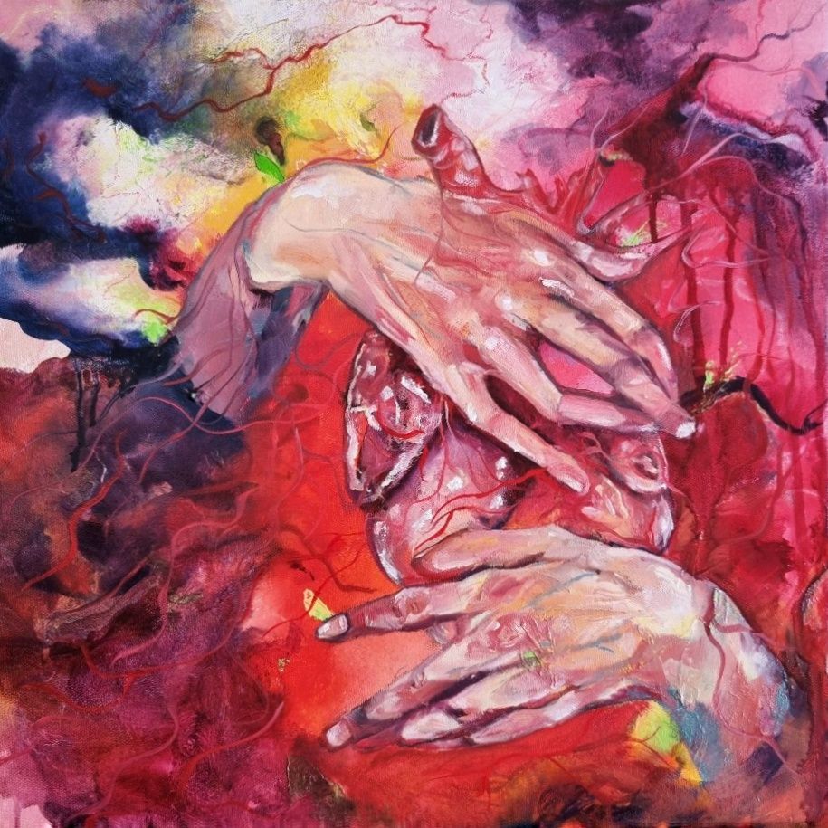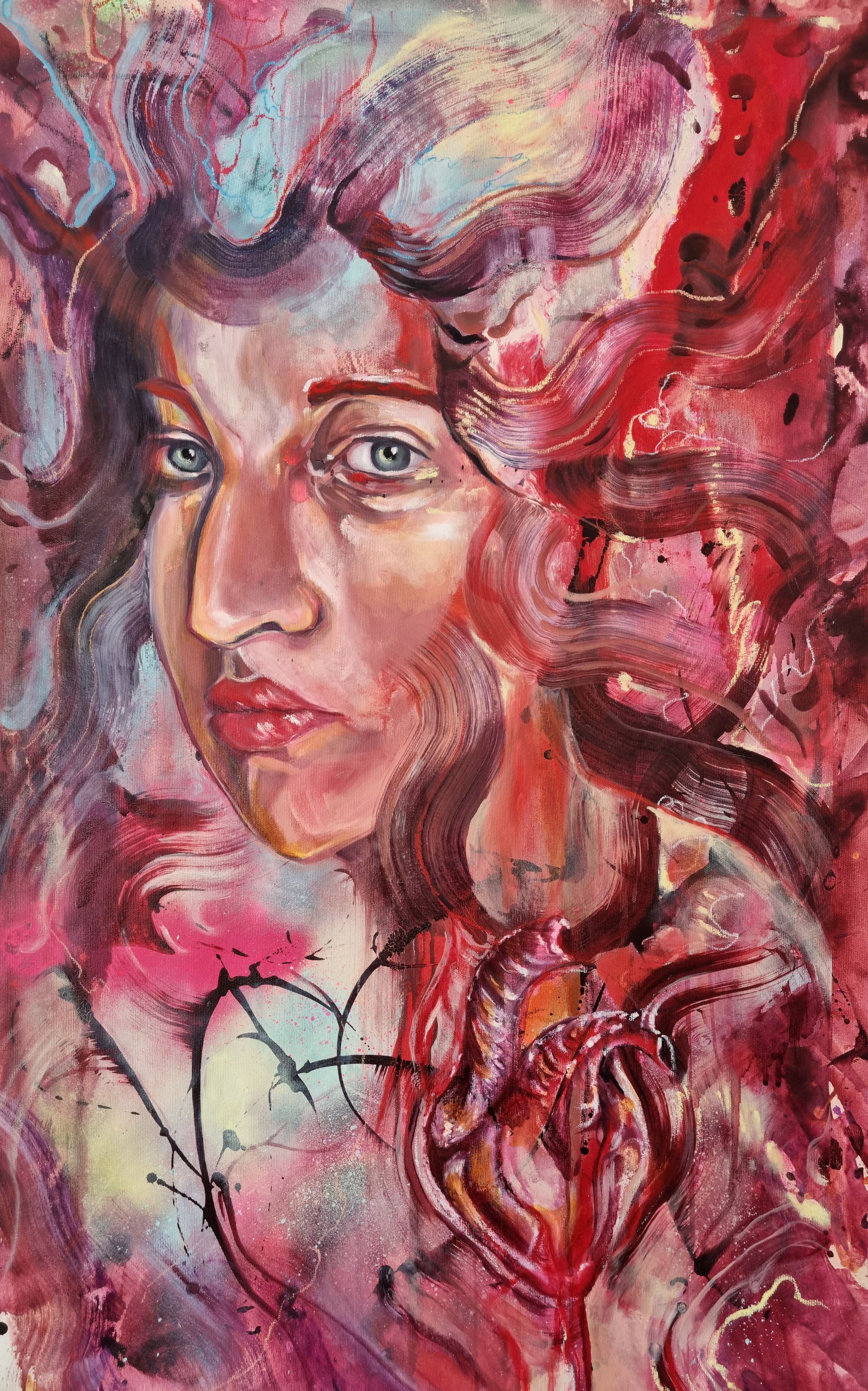 מתוך הכאוס שנוצר, אני מרגישה ומתחילה למשוך קצה חוט מסויים. ומתחילה לתת חיים למה שמבקש להתגלות מבפנים. את העבודה אני לרוב מסיימת בצבעי השמן.